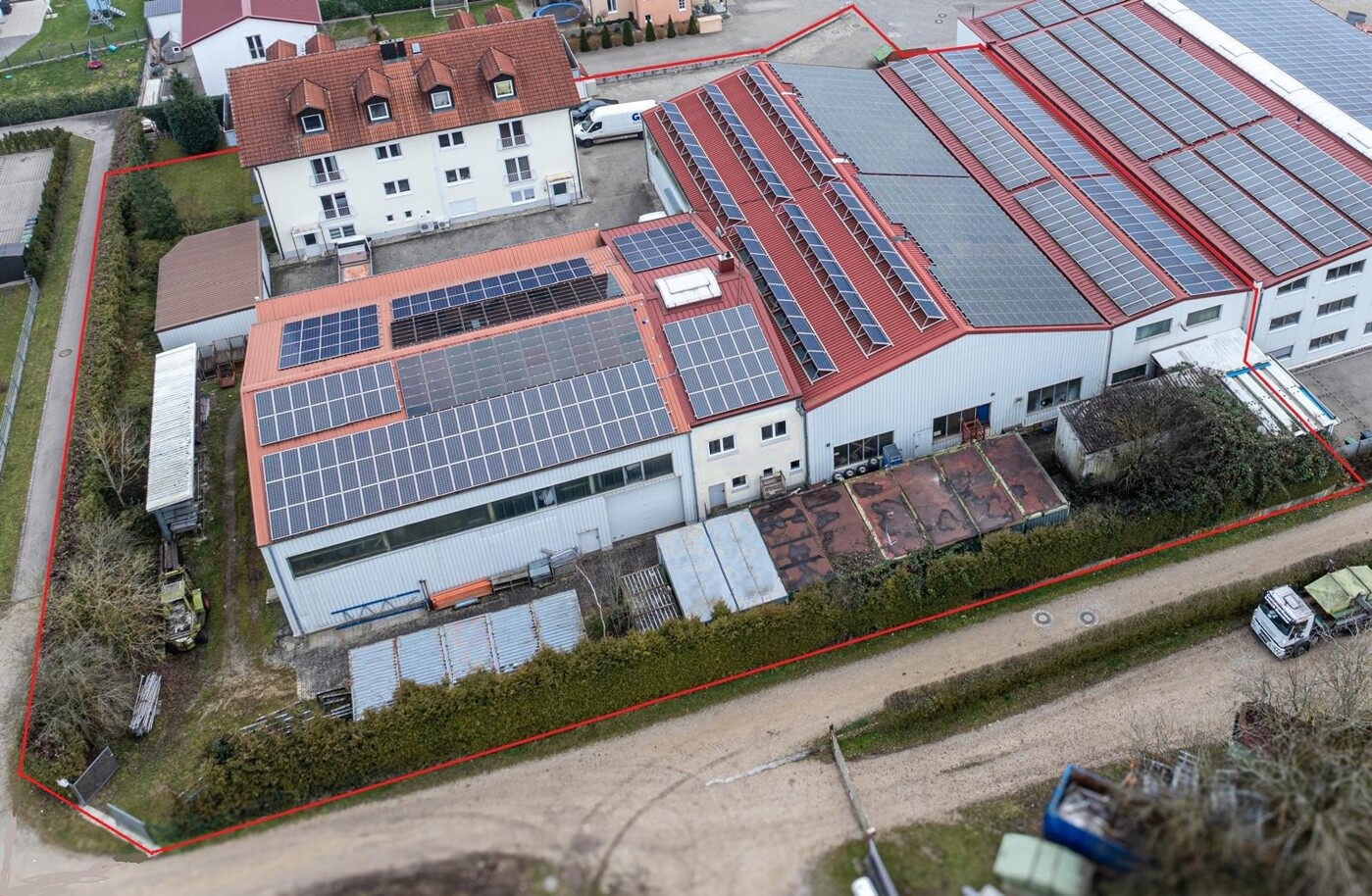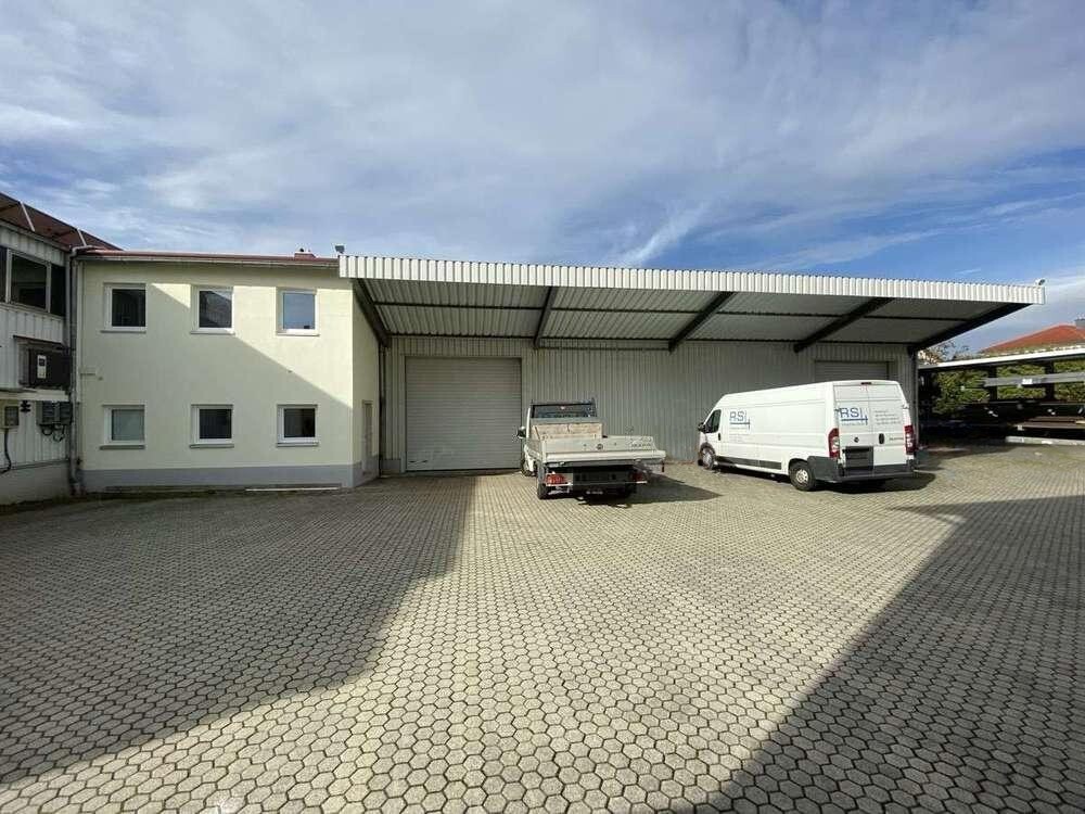 Industriehalle mit Kranbahn, Stahlskelettbau, Trapezblechverkleidung, Estrichfußboden, Bodenplatte, Heizstrahler, drei Tore, hofseitige Überdachung